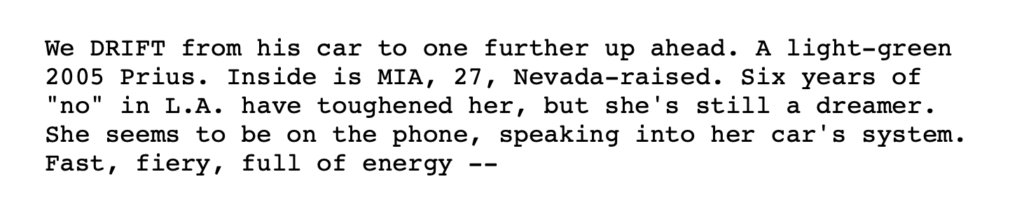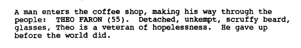 There are few points how to ensure your character description is doing its job. One good advice I picked up from the On the Page podcast episode, Never Judge a Character, was not to write a physical description. So instead of writing she wears a flowy kaftan, you could write she is a kind of person who sets up an altar of crystals and tarot cards when she travels to a new place. Don’t just put a costume on and assume everyone understands what the costume means. Especially when writing a treatment or synopsis, thinking about the essence of the character and seeding an image of the character, helps the reader to imagine and recognise different characters from the text.